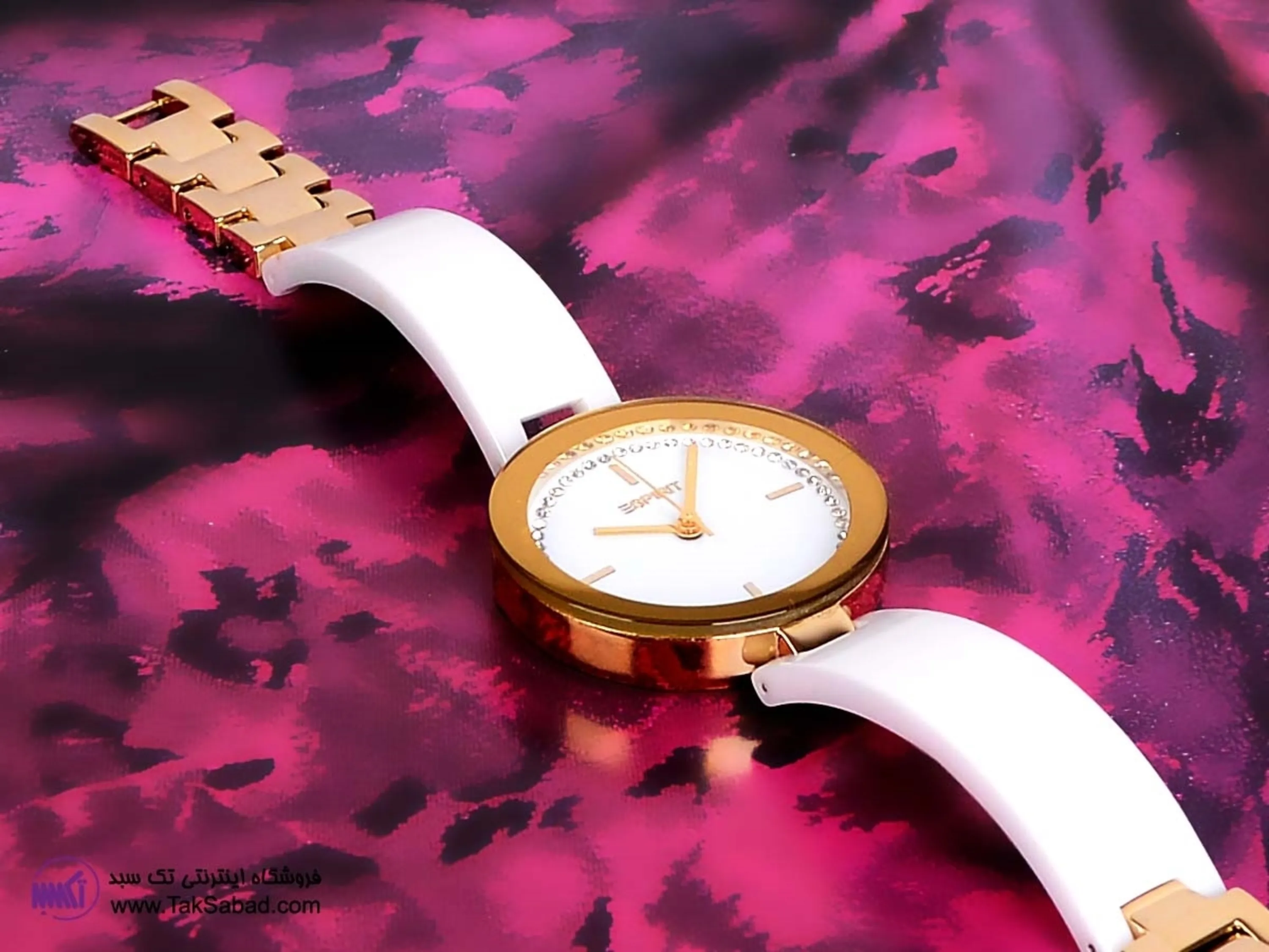 صفحه نمایش ساعت مچی بسیار ساده و شفاف بوده و با یک ردیف نگین در داخل تزیین شده است.دسته ساعت ترکیب لاک و دستبند فلزی است که واقعا جلوه خاصی به این ساعت مچی بخشیده است.این ساعت در برابر آب و رطوبت مقاوم می باشد.