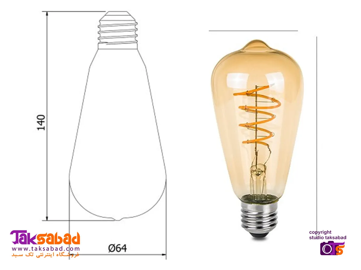 این محصول دارای ابعاد 64*140 میلی متر و وزن 80 گرم با جعبه می باشد و با دارا بودن سرپیچ E27 به شما این امکان را می دهد در هر کجا نیاز به استفاده از یک نور ملایم و یک لامپ نوستالژیک دارید به راحتی از آن استفاده کنید. ولتاژ مصرفی این لامپ 220-240V 50/60Hz می باشد. با استفاده از این لامپ رشته ای، می توانید یک طراحی و نورپردازی زیبا و نوستالژیک داشته باشید. استفاده از این لامپ با تولید نور زرد رنگ ملایم با شدت مناسب، در فضای داخلی کافی شاپ ها بسیار مرسوم می باشد و به هیچ عنوان چشم را اذیت نمی کند.