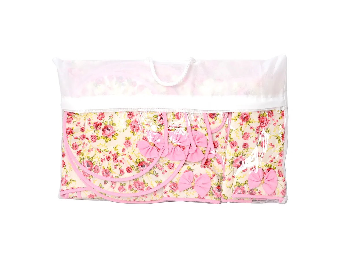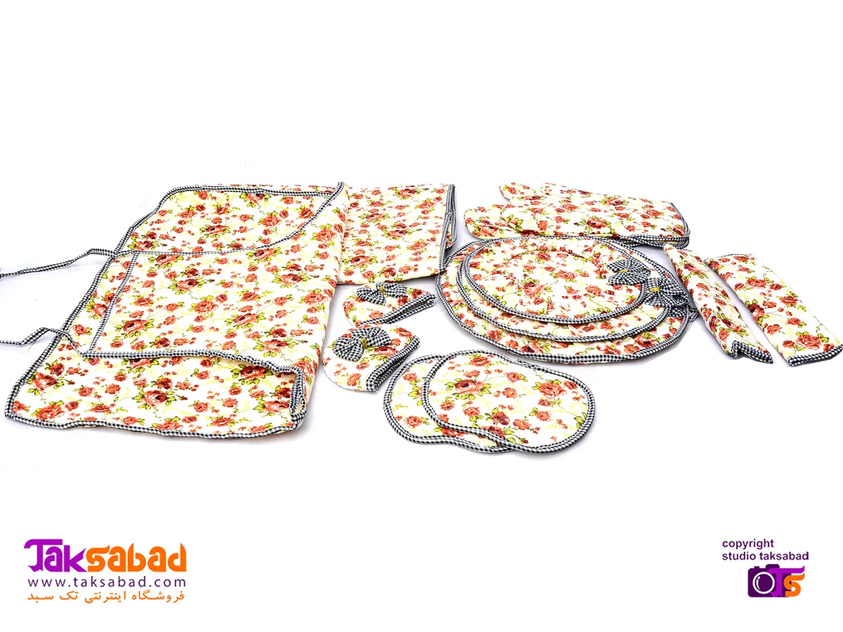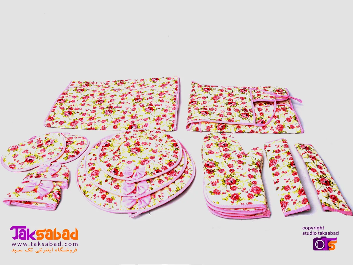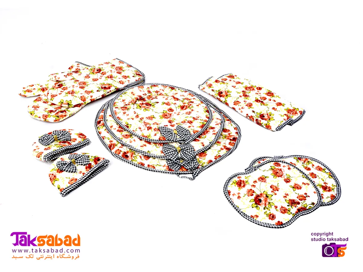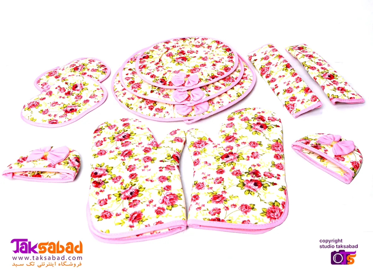 این ست شامل 3 عدد دم کنی، یک جفت دستگیره ساده، یک جفت دستگیره مخصوص دسته قابلمه، یک جفت دستکش فر، یک جفت کاور دستگیره گاز و یخچال، پیش بند و رو کابینتی برای آبگیری ظروف می باشد. همه اقلام دارای رودوزی، دوخت با کیفیت و در داخل یک کاور شفاف قرار گرفته اند. این کالا در دو رنگ گل قرمز و گل صورتی موجود است، لطفا رنگ مورد نظر خود را در قسمت پیام در هنگام ثبت سفارش ذکر نمایید.